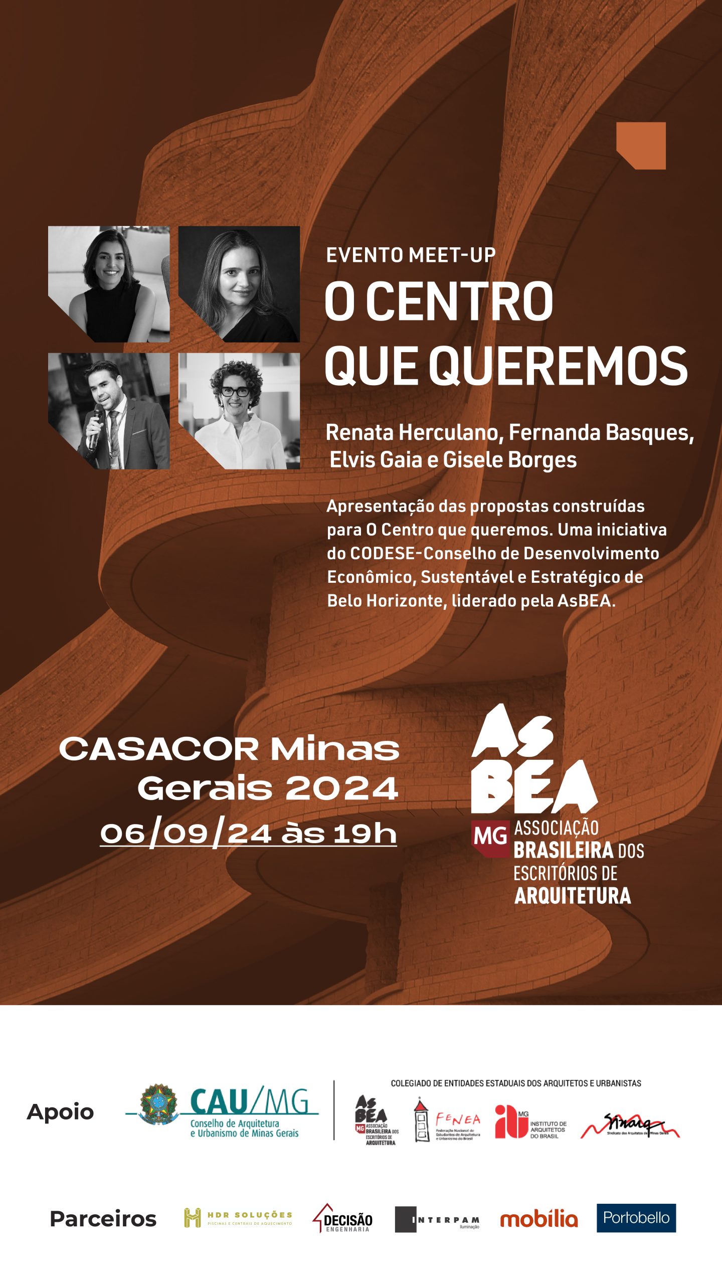 Participe do Meet-Up “O Centro que Queremos”, promovido pela AsBEA-MG, no dia 06/09 às 19h na CASACOR Minas Gerais 2024! Renata Herculano, Fernanda Basques, Elvis Gaia e Gisele Borges apresentarão as propostas construídas para “O Centro que queremos. Uma iniciativa do CODESE-BH, Conselho de Desenvolvimento Econômico, Sustentável e Estratégico de Belo Horizonte.